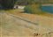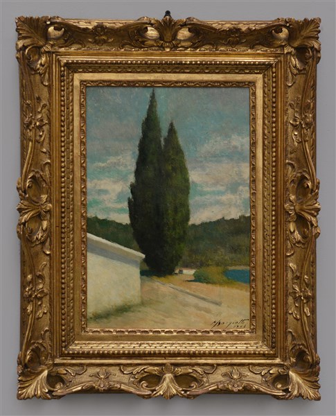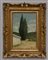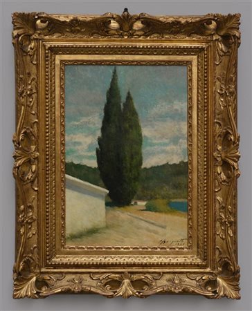 "Cipressi" 1964, olio su tavola (cm 38x26) Firmato e datato in basso a destra. Al retro: titolato, firmato e datato. In cornice