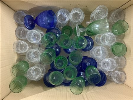 Cartone contenente numerosi bicchieri in vetro trasparente incolore, verde e blu (difetti)