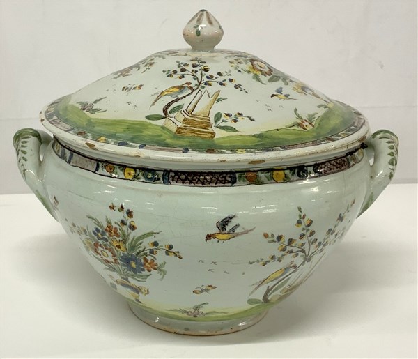 Zuppiera biansata con coperchio in ceramica con decoro in policromia a "giardino con vaso e colonna spezzata" (d. cm 26,5) (difetti)