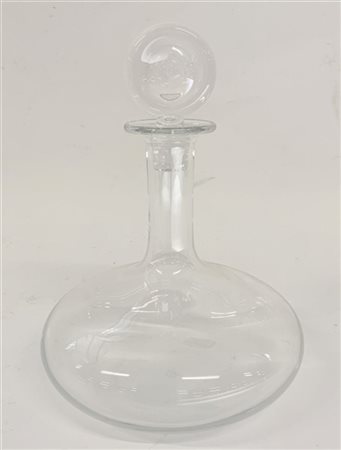 Bottiglia con tappo da distillato in vetro trasparente incolore con tappo. Francia, secolo XX. Firma all'acido sotto la base. (h cm 26)