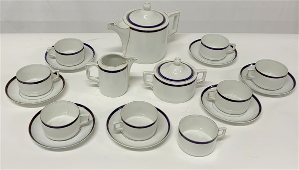 Manifattura H&C Selb Bavaria. Servizio da tè in porcellana profilata in oro e blu composto da otto tazze, sette piattini, una teiera, una zuccheriera e una lattiera (difetti)