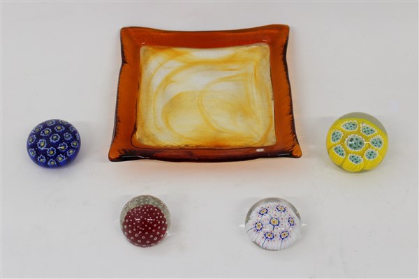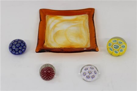 Lotto composto da un posacenere in vetro, firma incisa "La Murrina" e quattro presse papiers in vetro di epoche differenti.