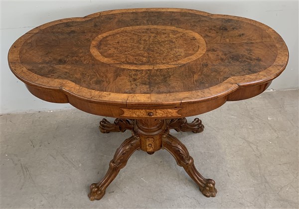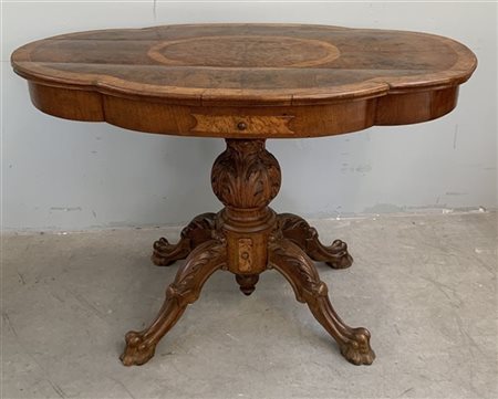 Tavolino a biscotto con base in legno intagliato a quattro gambe. Secolo XIX (cm 117x80x71,5) (difetti)