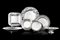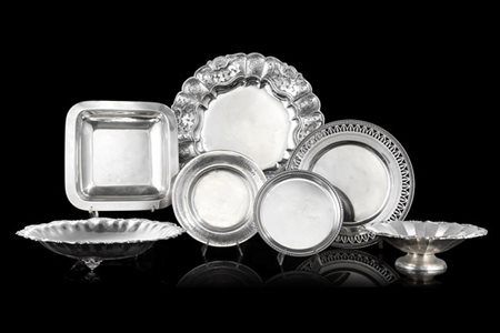 Lotto composto da due alzate, uno svuota tasche e quattro piatti in argento di decoro e manifatture differenti. Titolo 800 (g 1300)