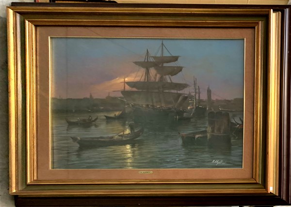 "Veliero al tramonto" olio su tela (cm 60x70) Firmato in basso a destra. Al retro: firmato e datato '81. In cornice