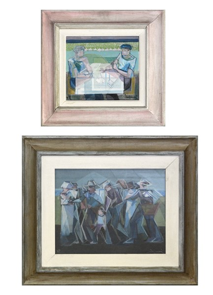 Lotto composto da due dipinti a tecnica mista, uno su masonite e uno su carta, di misure diverse, raffiguranti figure, firmati D. Schinan in basso a destra; firmati e iscritti a retro