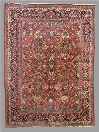 Tappeto Mahal, Persia, secolo XX. Decoro floreale all over su fondo rosso. Bordura a cartigli su fondo blu (Difetti, rapature) (cm 360x264)