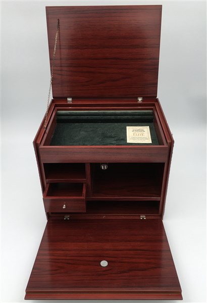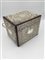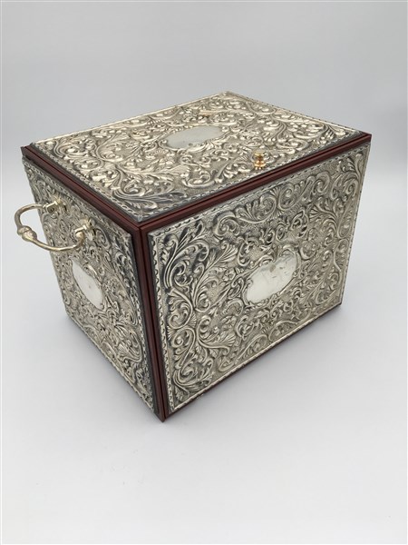 Scatola portagioie interamente rivestita in lamina d'argento decorata a motivi vegetali e cartigli, all'interno vani e cassettini (cm 30x25x25) (difetti)