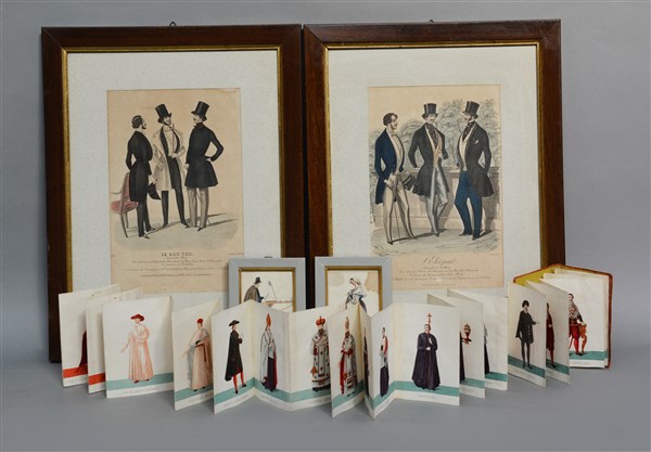 Lotto composto da un libretto a fisarmonica contenente trenta incisioni acquerellate raffiguranti figure ecclesiastiche e militari unito a quattro stampe diverse in cornici (difetti)