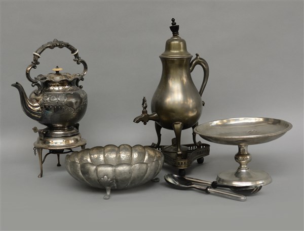Lotto composto da due samovar, un alzatina, un centrotavola e due posate da insalata in metallo, metallo argentato, peltro e lamina d'argento (difetti)