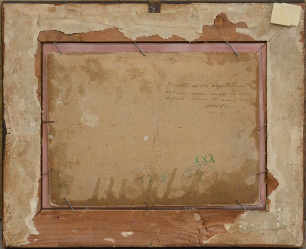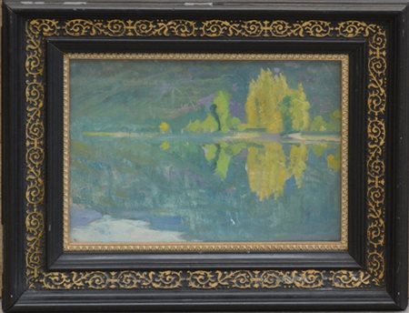 (Attribuito) "Paesaggio lacustre" olio su cartone pressato (cm 21x28) Al retro: iscrizione per autentica datata 1906. In cornice