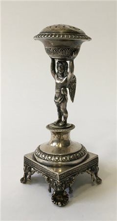 Saliera in argento sbalzato con sostegno a guisa di cherubino, piedi a valva di conchiglia. Punzoni di Milano, secolo XIX (h. cm 12,3) (g 100) (difetti e ammaccature)