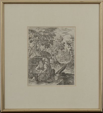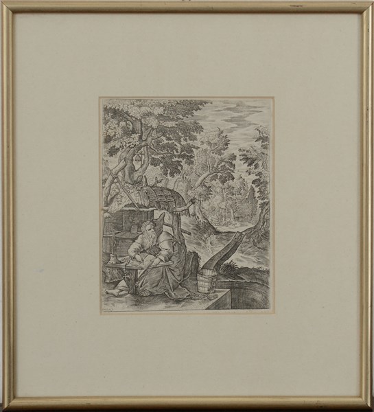 Antica incisione raffigurante frate in un paesaggio (cm 18x15) in cornice (dife