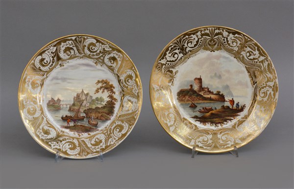 Manifattura di Dresda secolo XIX, coppia di piatti in porcellana decorata nel cavetto in policromia a paesaggi e sul bordo a fregi in oro (d cm 22) (difetti)