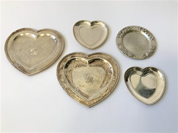 Quattro piccoli vassoi in argento in forma di cuore di cui due centrati da mono