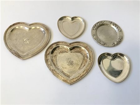 Quattro piccoli vassoi in argento in forma di cuore di cui due centrati da monogramma CR e titolati 800, gli altri due titolati 925. Uniti ad un piattino in argento titolo 800 con bordo sbalzato a frutti (l. max cm 15,5) (g 360)