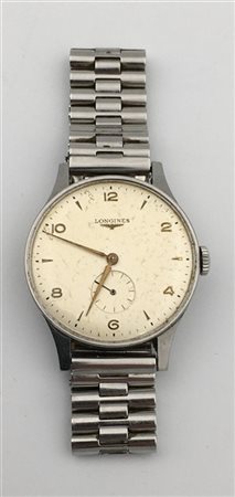 LONGINES. Orologio da polso da uomo in acciaio. Movimento con carica manuale. Quadrante con numeri arabi quadrantino ausiliario per i secondi alle ore sei. Diam. mm 37. (difetti e mancanze)