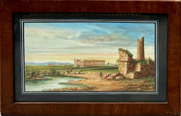 Ignoto del XIX Secolo "Veduta di Paestum" acquerello su carta (cm 24x41) In cor