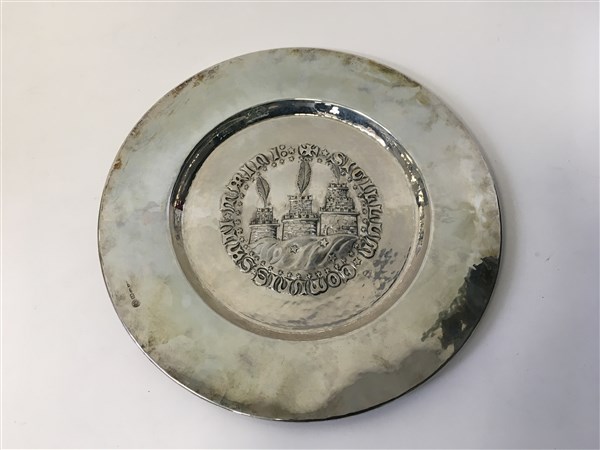 Piatto tondo in argento martellato e sbalzato nel cavetto con simbolo della cit