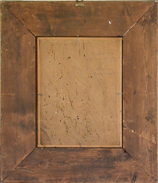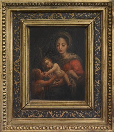 Ignoto "Madonna con Bambino e San Giovannino" antico dipinto ad olio su tavola (27x20). In cornice
