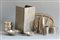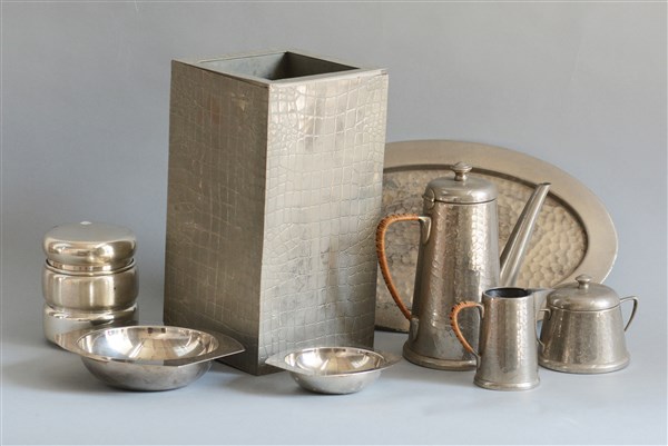Lotto composto da un vassoio con caffettiera, zuccheriera e lattiera, un vaso, una scatola con coperchio e due ciotole in metallo e metallo argentato (difetti)