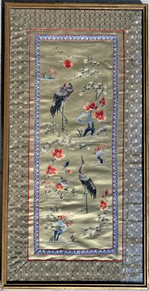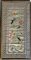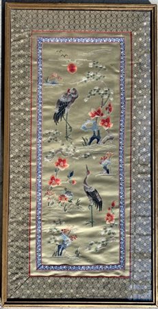 Ricamo in seta lanciata policroma su fondo di raso di seta color salvia raffigurante paesaggio con volatili, rocce e rmi fioriti (Difetti) (cm 52x20)