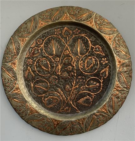 Manifattura turca, piatto in rame a decoro floreale (d cm 61) (difetti)