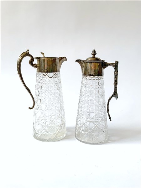 Lotto di due caraffe in cristallo molato con anse e ghiere in argento sbalzato, punzoni inglesi (h max cm 25) (difetti)
