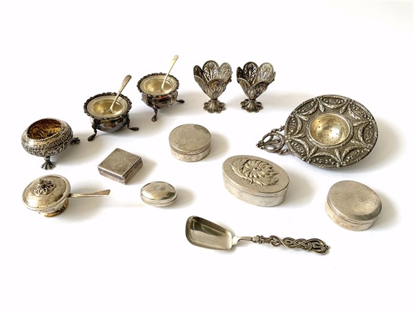 Lotto di quindici piccoli oggetti in argento di forme e misure differenti (g. 390 ca) (lievi difetti)