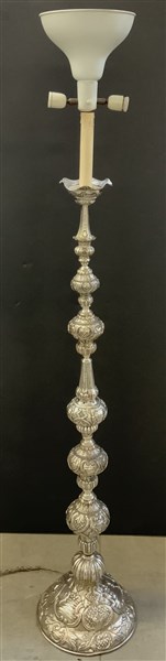 Torciera in rame argentato e sbalzato a volute e foglie (h cm 135) (difetti)