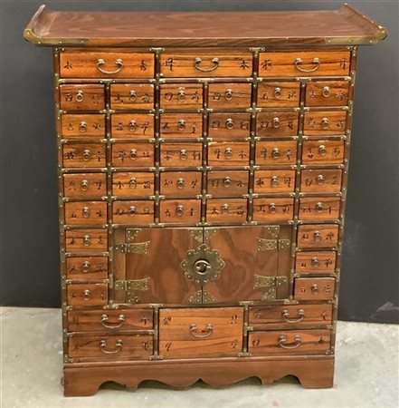 Manifattura orientale, mobiletto a quarantanove cassettini di diverse misure incisi con ideogrammi e due antine con applicazioni in metallo fine secolo XIX (difetti)
