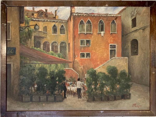 Magni "pranzo all'aperto" olio su compensato (cm 54x75) firmato in basso a dest