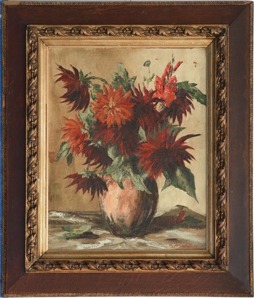 K. Martin "Natura morta con fiori" olio su cartone telato (cm 48x38) Firmato in basso a destra, in cornice