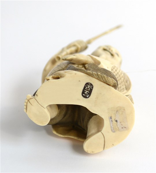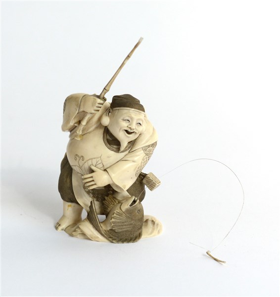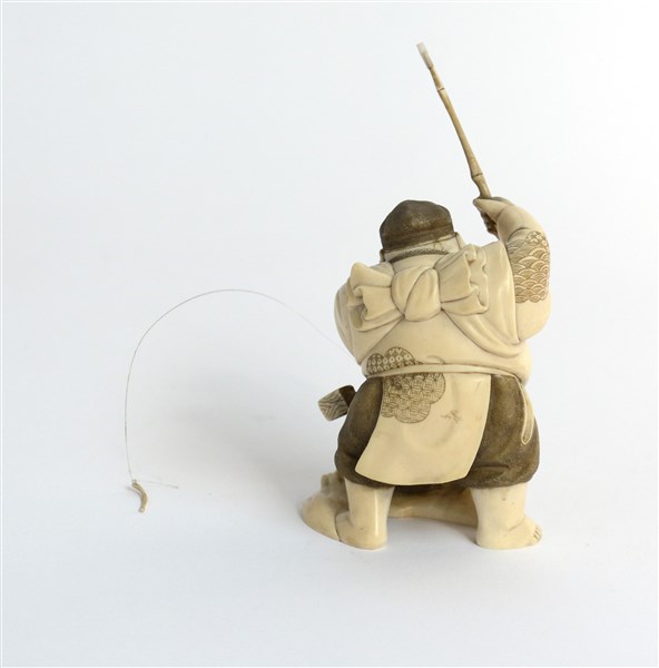 Okimono in materiale a imitazione dell'avorio raffigurante pescatore. Giappone,