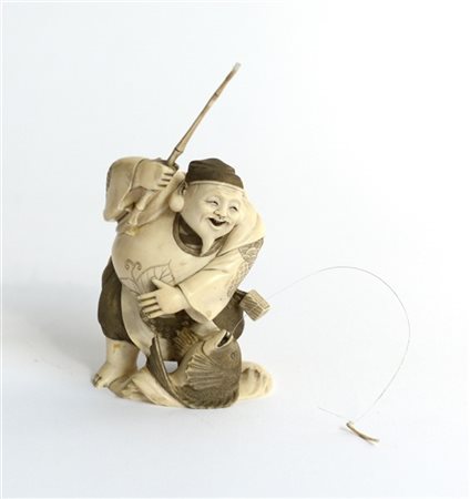 Okimono in materiale a imitazione dell'avorio raffigurante pescatore. Giappone, inizio secolo XX (h cm 16)