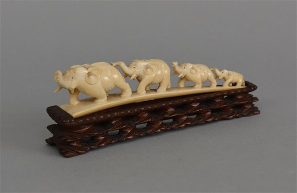 Manifattura orientale, gruppo di elefantini in avorio, base in legno, inizi secolo XX (difetti)