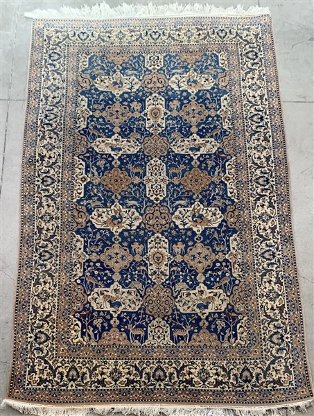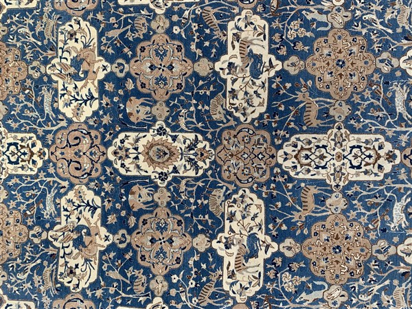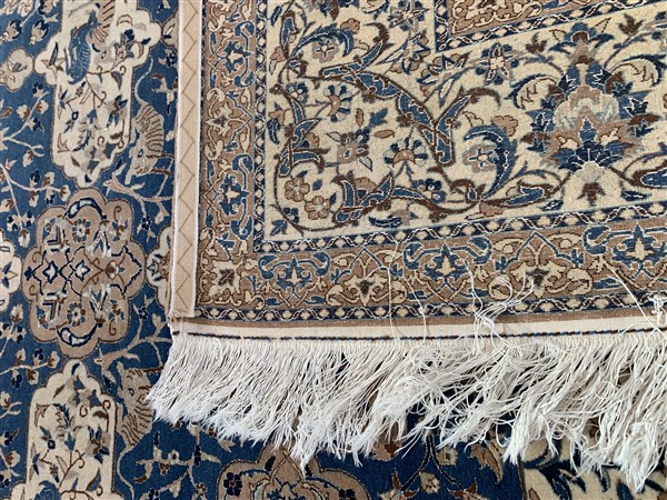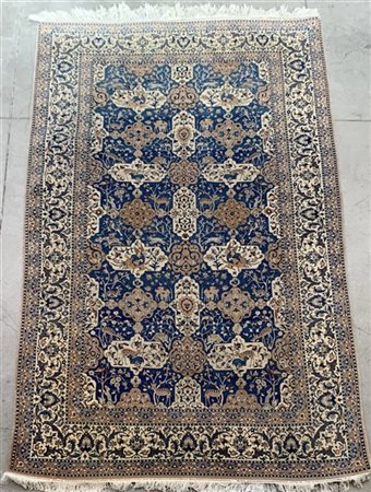 Tappeto Nain, Persia, secolo XX. Annodato in lana e seta, decoro a giardino nei toni del nocciola, beige, marrone, blu e azzurro su fondo azzurro carta da zucchero. Elegante bordura Herati su fondo bianco (Lievi difetti) (cm 271x167)