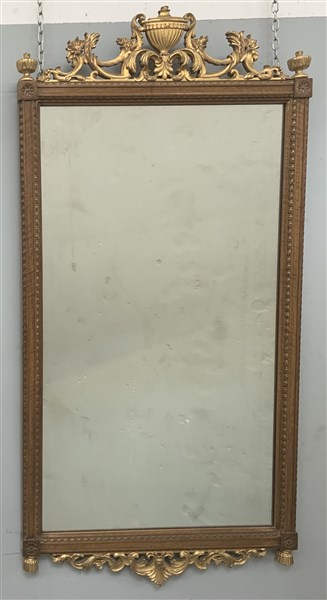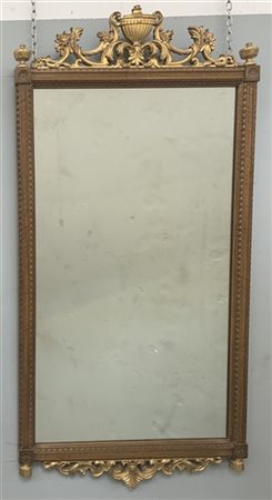 Specchio verticale in legno con cimasa e grembiale in legno intagliato, traforato e dorato a motivi vegetali e fregi (cm 125x60) (difetti, rotture e mancanze)