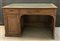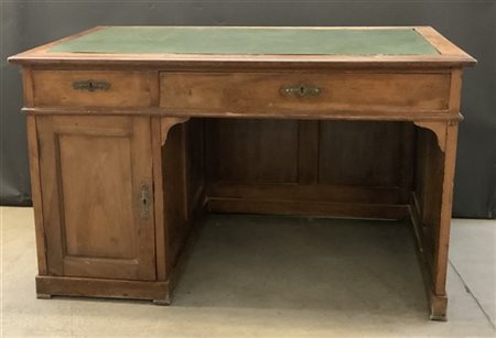 Scrivania in noce con due cassetti diversi sottopiano e anta laterale sinistra. Piano rivestito in finta pelle (cm 135x80x85) (difetti)