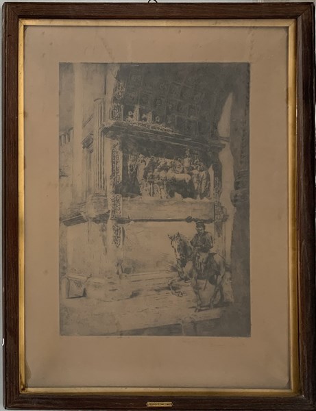 "Vittorio Emanuele II passa l'Arco di Costantino" acquaforte (cm 65x45) Firmato e datato 1890 in lastra in basso a sinistra. In basso a destra dedicata. In cornice