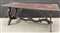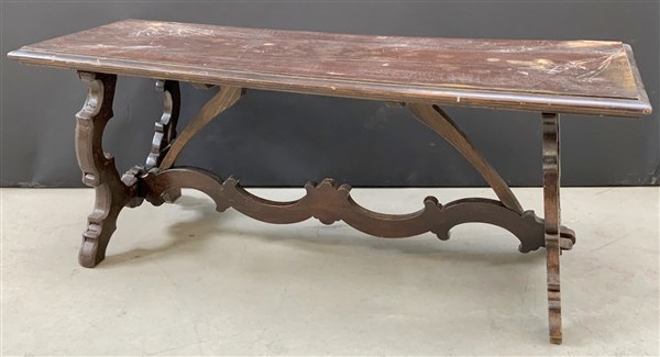 Tavolino basso con sostegni sagomati a lira e traversa analoga (cm 124x50x45) (difetti e mancanze)