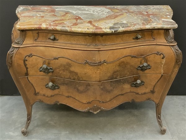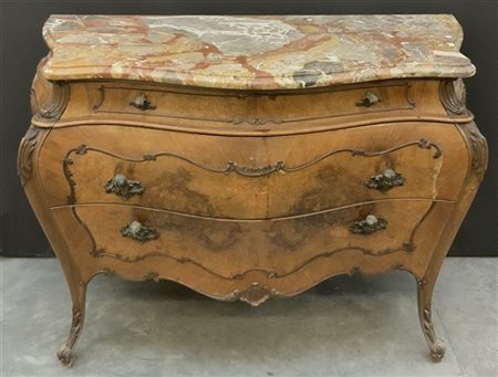 Comò bombato con fronte a due cassetti e mezzo decorato con sagomette in rilievo, montanti intagliati e piano in marmo. Guarnizioni in bronzo a testa di putto a tutto tondo (cm 132x89x63) (difetti)