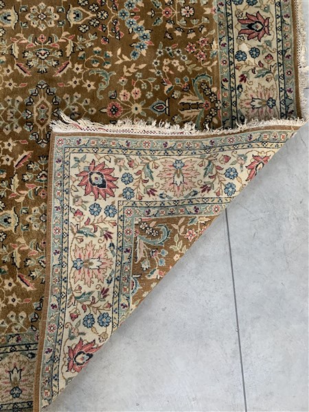 Tappeto Tabriz, Persia, secolo XX. Decoro all over floreale nei toni dell'azzurro, rosa, verde, bianco e blu su campo color tabacco (Lievi difetti) (cm 299x197)