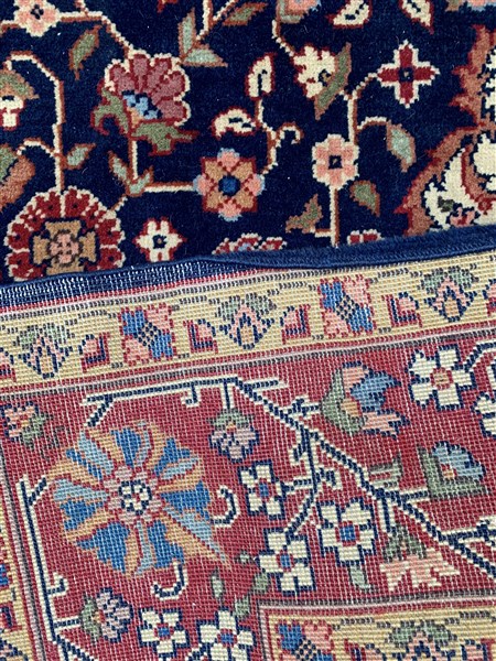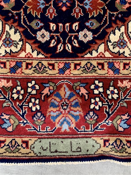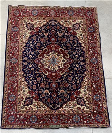 Tappeto di tipo orientale, Romania, secolo XX. Decoro con medaglione stellato nei toni del rosa, azzurro, bianco, cherubino su fondo blu notte. Una testata, cartiglio con iscrizione islamica (Difetti)(cm 235x165)