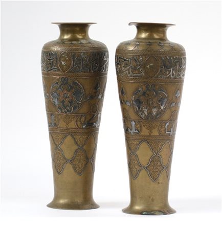 Coppia di vasi in rame e ottone recanti iscrizioni islamiche. Fine secolo XIX (h cm 27,5) (lievi difetti)