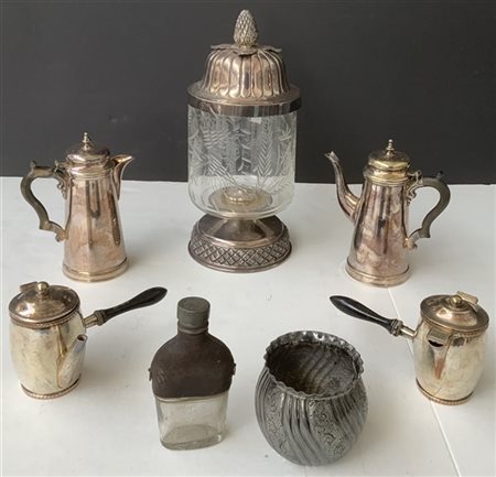Lotto composto da sette oggetti in vetro e metallo argentato di forme e usi dif