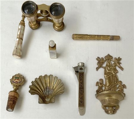 Lotto composto da sette oggetti in metallo dorato tra cui si segnalano una penna, un posacenere a forma di valva di conchiglia, un cannocchiale con manico in madreperla ed una piccola acquasantiera raffigurante l'Incoronazione della Vergine (difetti)