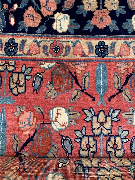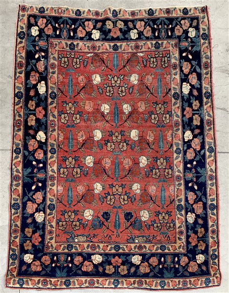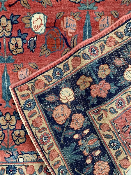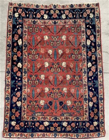 Tappeto Tabriz, Persia, secolo XX. Decoro con file di cipressi e rami fioriti policromi su fondo rosa carico. (Difetti e rotture) (cm 192x136)