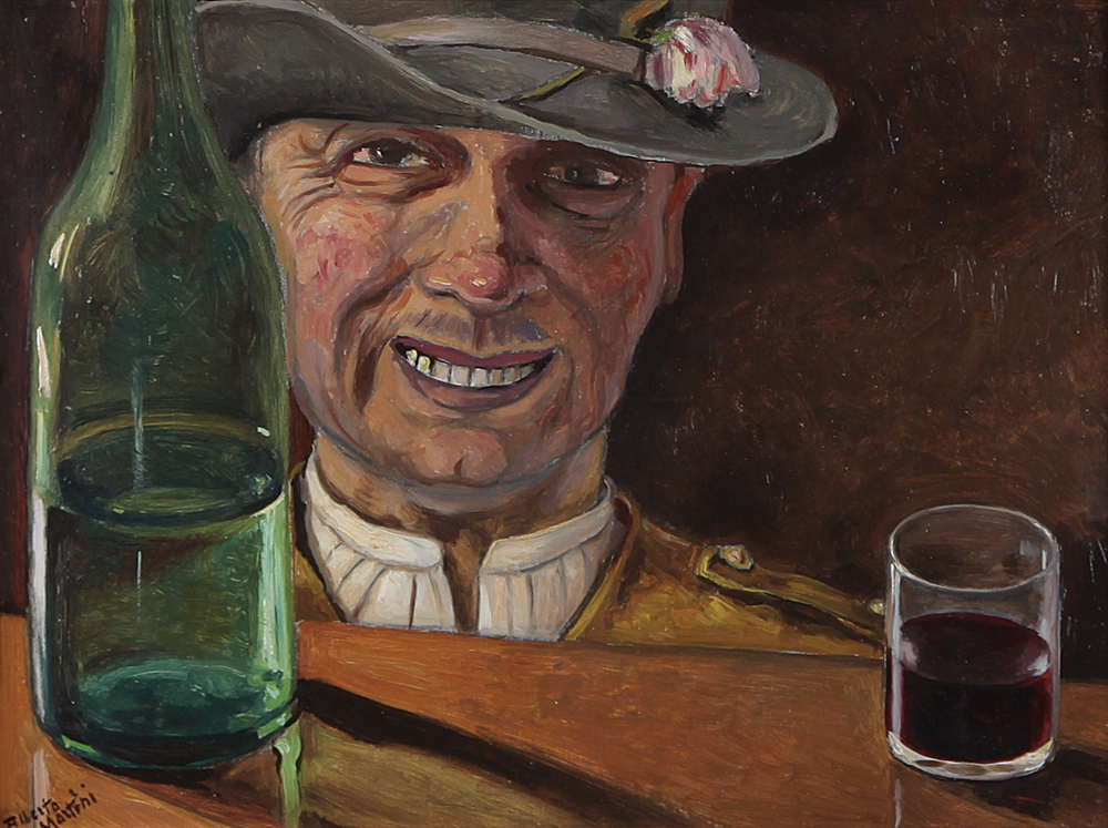 ALBERTO MARTINI Oderzo (Tv) 24/11/1876 - Milano 08/11/1954 Guardiacaccia, al bar dei cacciatori, 1942 olio su cartone cm. 30x39,5; firma in basso a sinistra, titolo, firma, anno ed etichetta della Galleria Annunciata (MI) al retro.