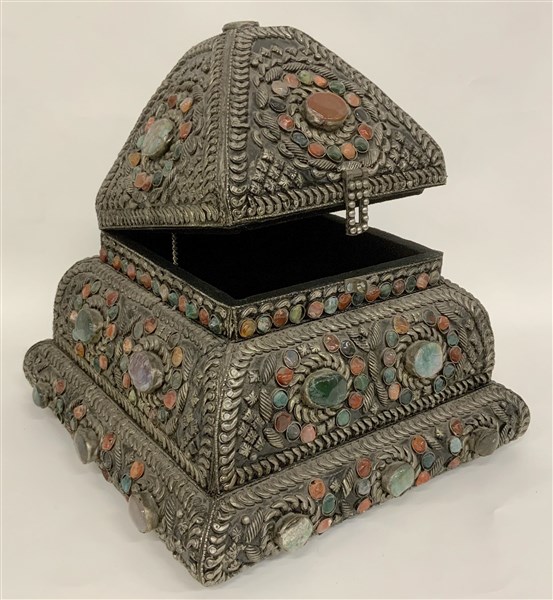 Manifattura orientale. Cofanetto di forma piramidale in metallo argentato e pietre dure